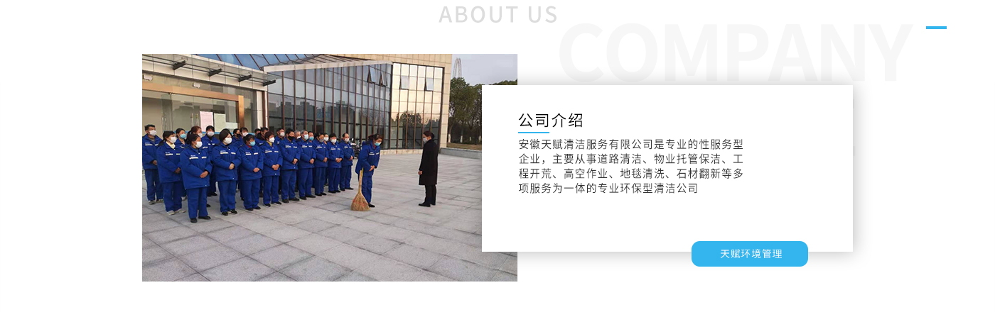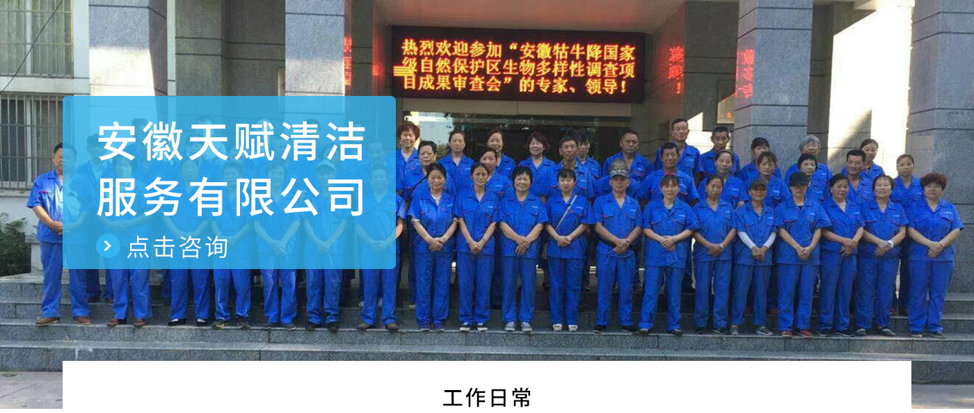 安徽天賦清潔服務(wù)有限公司是的服務(wù)型企業(yè),主要從事道路清潔、物業(yè)托管保潔、工程開荒、高空作業(yè)、地毯清洗、石材翻新等多項(xiàng)服務(wù)為一體的環(huán)保型清潔公司。公司管理機(jī)制完善,清潔作業(yè)經(jīng)驗(yàn)豐富,擁有技術(shù)力量,嚴(yán)格實(shí)行崗前培訓(xùn)—崗中督查—上崗在培訓(xùn)的員工管理措施,憑著優(yōu)良的清潔質(zhì)量和嚴(yán)格的督查管理,為眾多企事業(yè)單位、醫(yī)院、酒店、廠區(qū)商場、物業(yè)、道路、學(xué)校、公園等提供后勤清潔服務(wù)。在業(yè)內(nèi)擁有良好的口碑。工作人員,服務(wù)態(tài)度優(yōu),竭力為客戶提供好的保潔服務(wù)。安徽天賦清潔服務(wù)有限公司:致力于長期合作關(guān)系,提高服務(wù)質(zhì)量,提供高標(biāo)準(zhǔn)的清潔服務(wù)。公司的經(jīng)營理念:為營造一個更清潔、亮麗的生活和工作環(huán)境而努力!“誠信”是公司成功保證。“客戶至上,信譽(yù)為首”是公司宗旨。高標(biāo)準(zhǔn)提供服務(wù),維護(hù)客戶利益、形象,是我始終不渝的目標(biāo)。